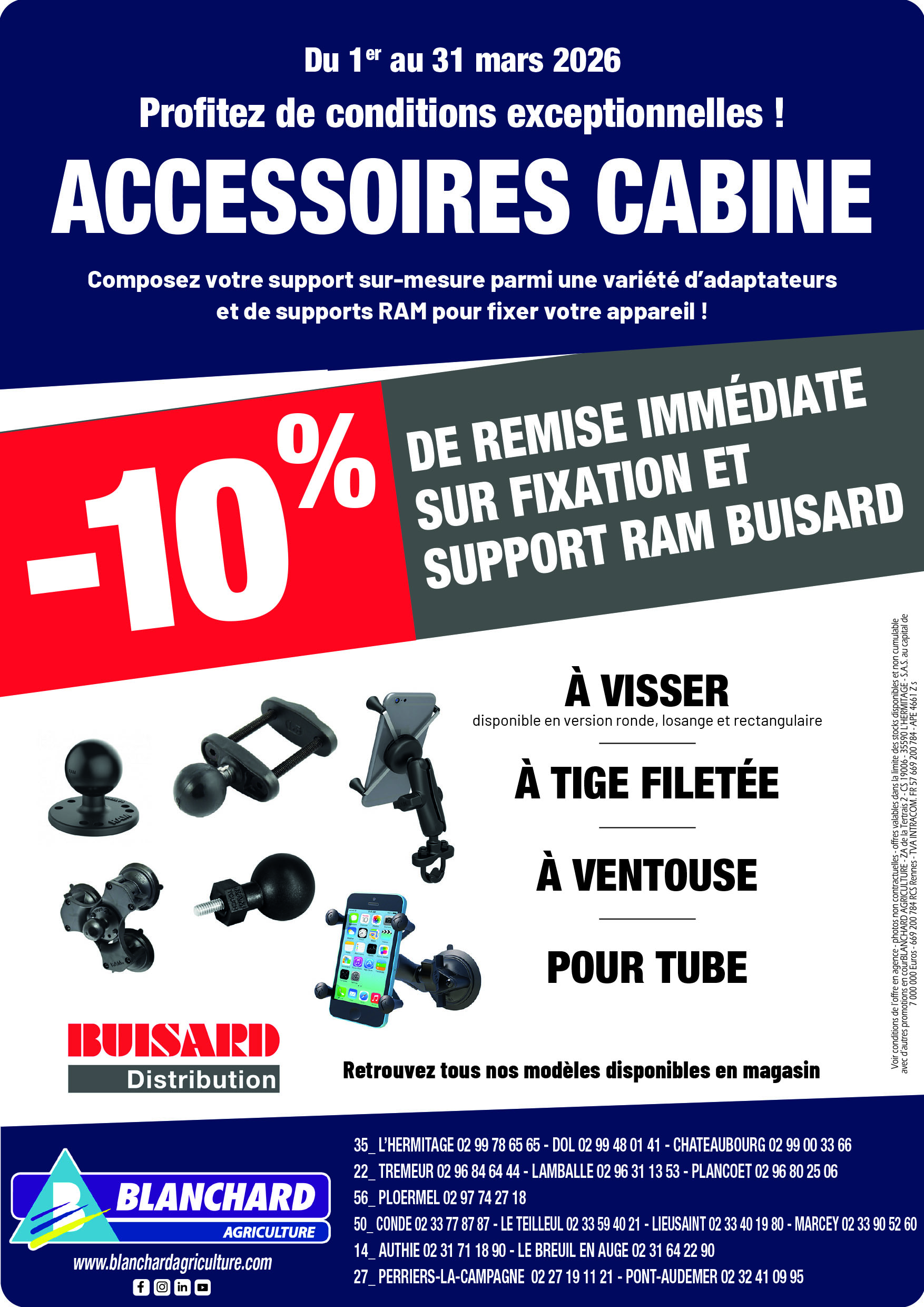 COMPOSEZ VOTRE SUPPORT SUR-MESURE POUR FIXER VOTRE APPAREIL ! C'est le moment de vous rendre dans votre agence Blanchard Agriculture la plus proche et de bénéficier de 10% de remise sur fixation et support RAM.
