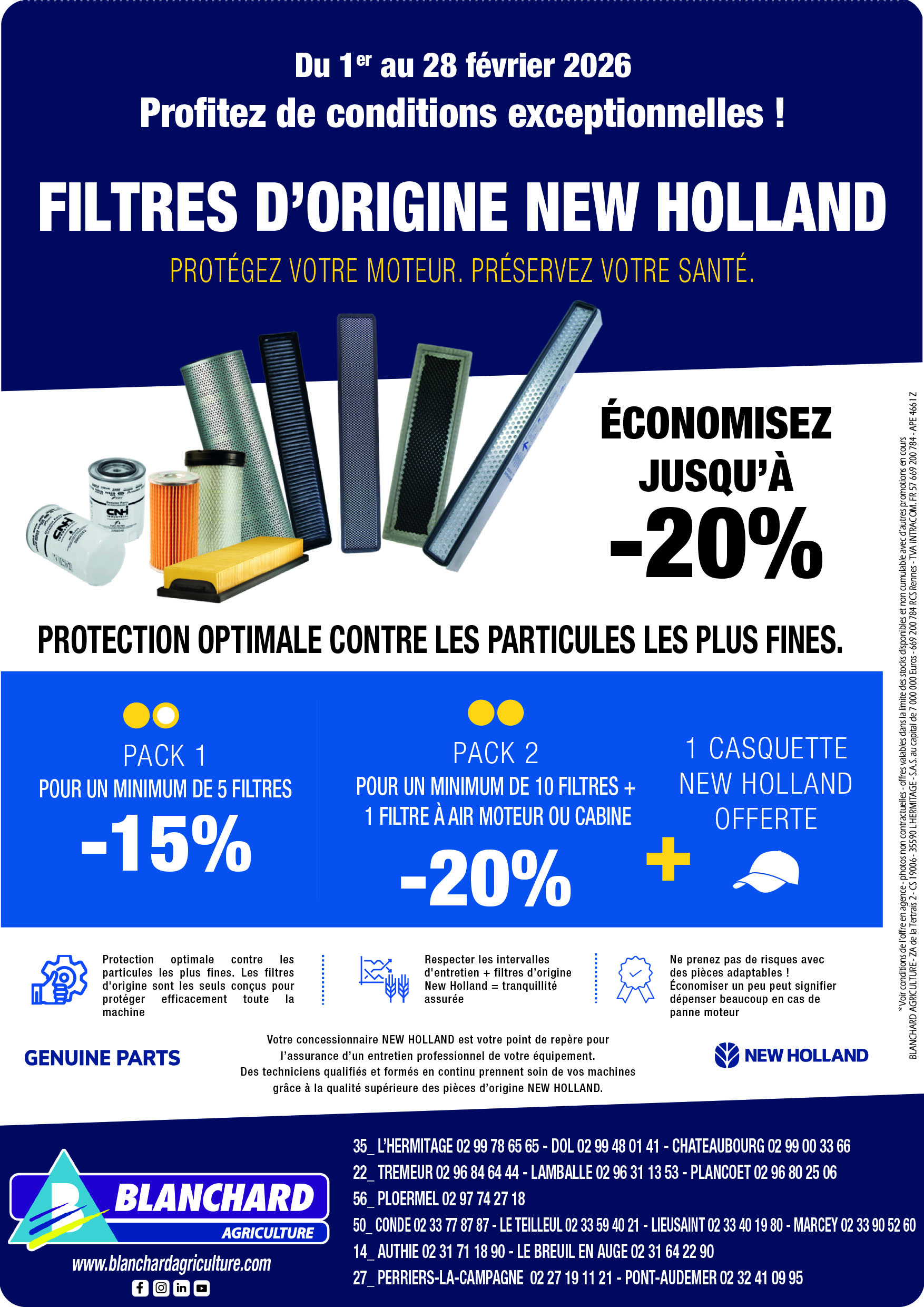 OPÉRATION FILTRES : C'est le moment de vous rendre dans votre agence Blanchard Agriculture la plus proche et de bénéficier jusqu'à 20% de remise sur les filtres New Holland.