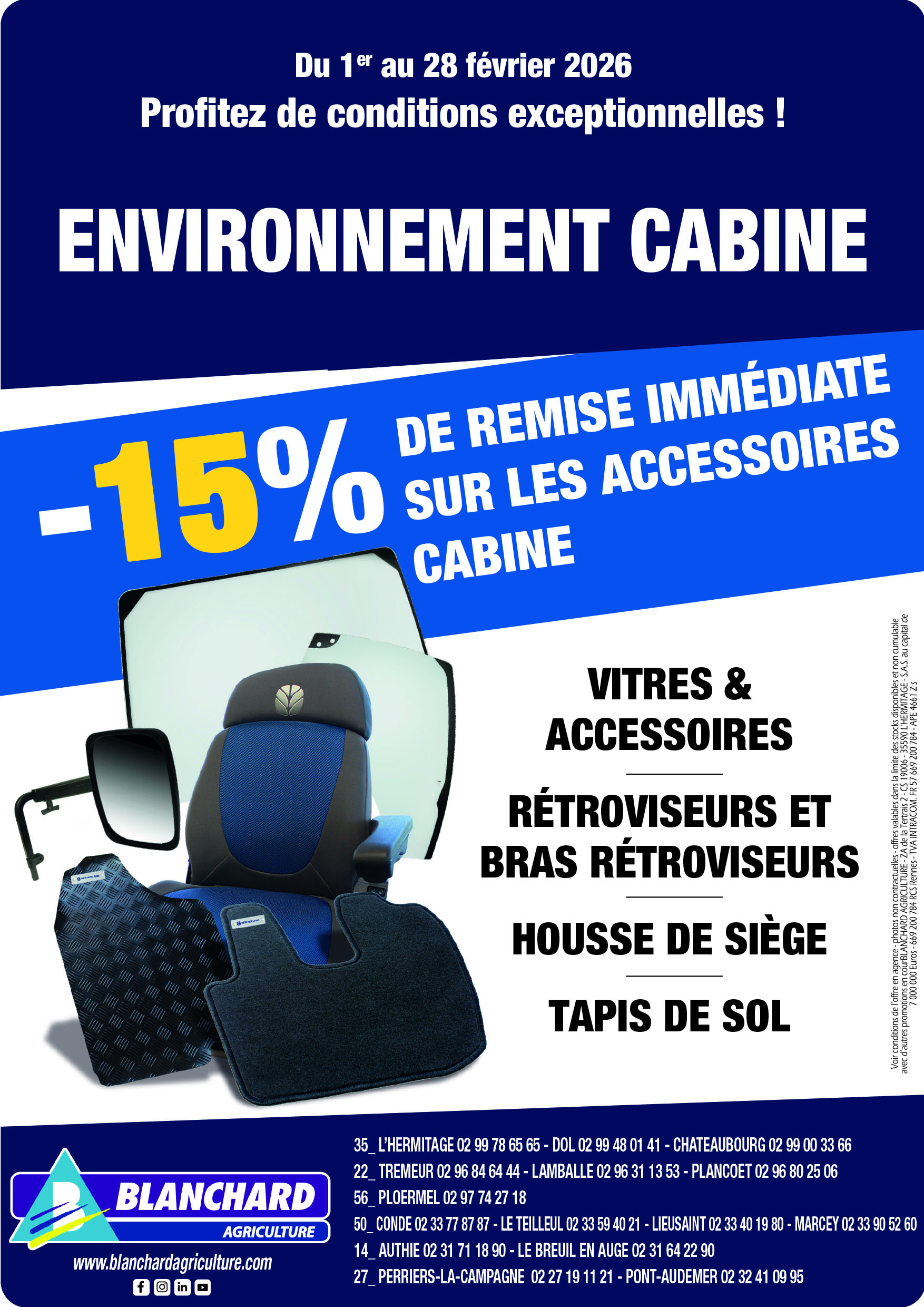 OPÉRATION ENVIRONNEMENT CABINE : C'est le moment de vous rendre dans votre agence Blanchard Agriculture la plus proche et de bénéficier de 15% de remise sur les accessoires cabine.