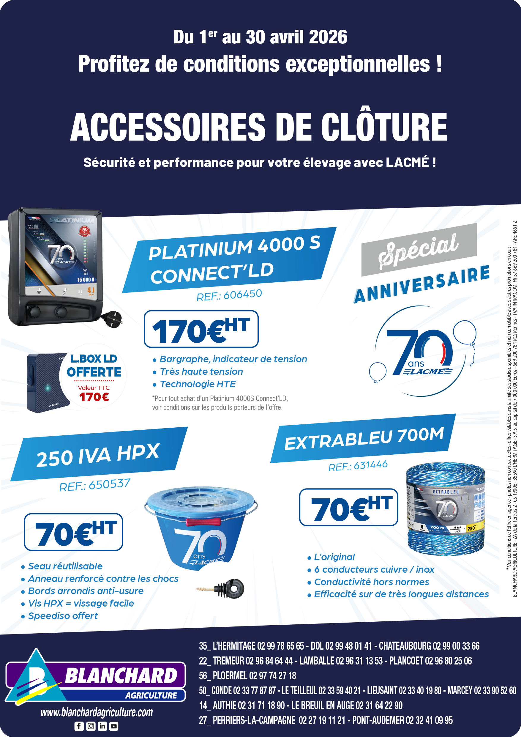 SPÉCIAL ÉLEVAGE : Profitez d'offres exceptionnelles sur les accessoires de clôture ! Installer, entretenir et sécuriser efficacement vos clôtures avec Lacmé. Rendez-vous en agence.