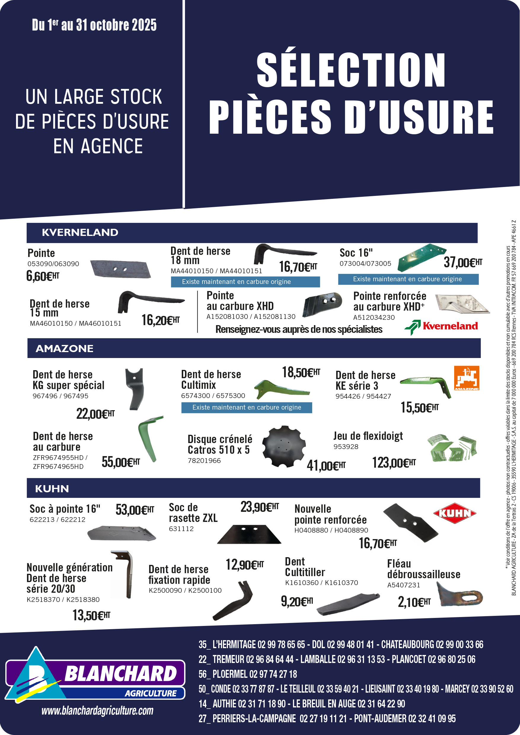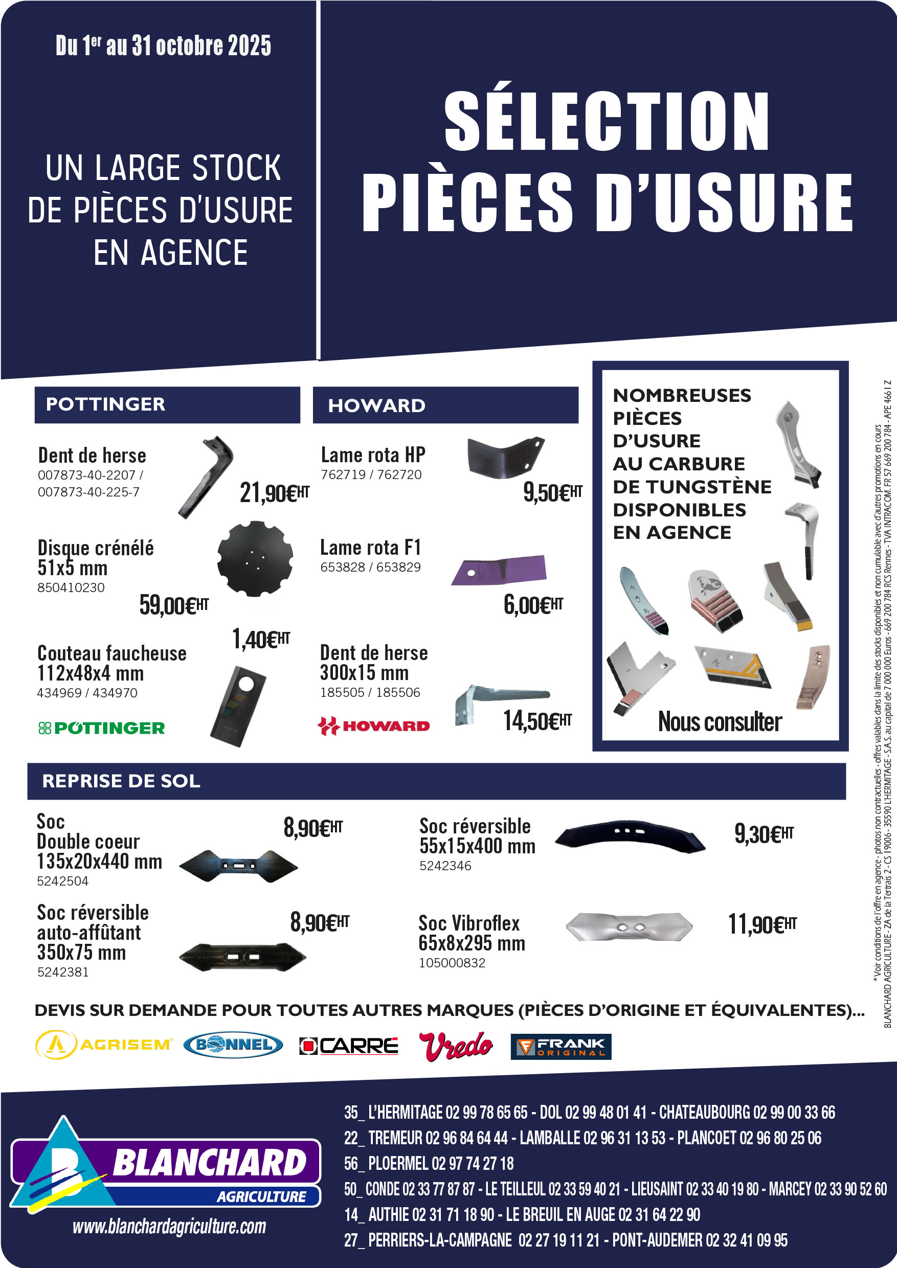 C'est le moment de vous rendre dans votre agence Blanchard Agriculture la plus proche et de profiter de nos conditions sur les pièces d'usure (large stock en agence).